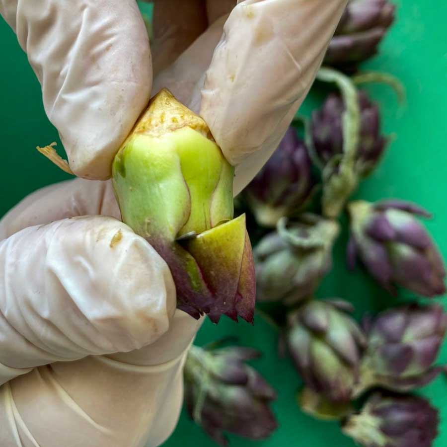 La raccolta avviene rigorosamente a mano, uno per uno. Anche la pulizia e la lavorazione seguono metodi tradizionali, senza automatismi industriali. Ogni carciofino viene selezionato, lavato e preparato con attenzione, preservando integrità e struttura.